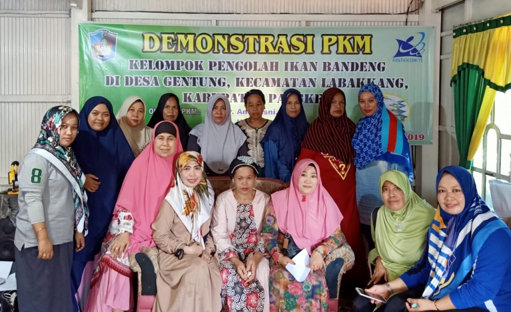 Dosen Fakultas Perikanan dan Ilmu Kelautan Universitas Muslim Indonesia, Dr. Ir. Andi Asni, MP Dr. Ir. Hamsiah, M.Si. dan Dr, Ir. Kasmawati, MP. memberi pelatihan pembuatan Bandeng Presto bagi ibu-ibu pada kelompok “Diva” Di Desa Gentung Kecamatan Labakkang, Kabupaten Pangkep sebagai kelompok mitra (27/7/2019).